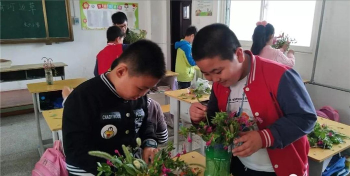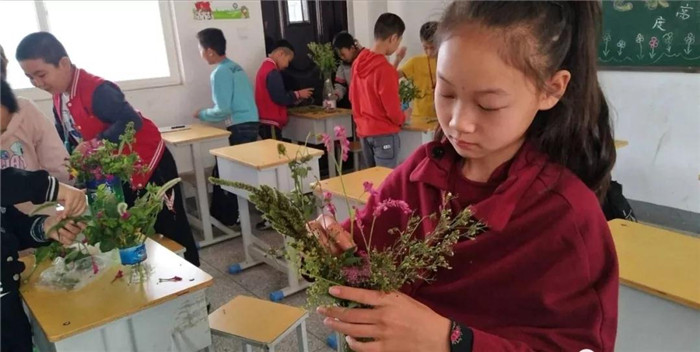 每节直播课前,各班级都提前让学生们准备工具材料,打开触控一体机调试好设备,静待课程开始。在网络授课老师的讲解中,孩子们了解到插花的基本知识,并在助学老师的指导下亲手完成了人生的第一件插花作品。