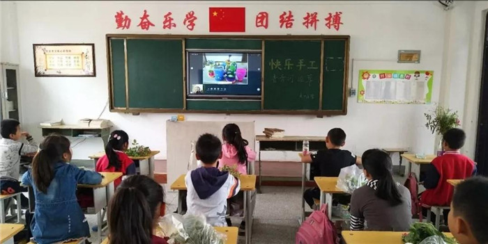 9月17日,交口乡中心小学的孩子们通过教室里的触控一体机学习网络直播课。讲课的是来自三门峡卢氏县的黄艳芬老师,她带来的是一节手工课《青青河边草·插花》。