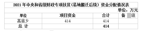 中央易地搬迁专项资金:下达2021年中央及省级财政专项扶贫资金(扶贫发展)预算的通知(三湖财预〔2021〕74号)414万元。
