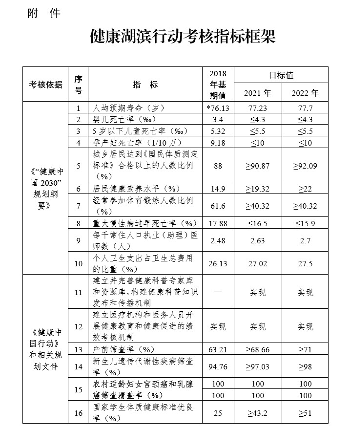 围绕健康湖滨建设主要目标任务要求,兼顾数据的可获得性,结合我区实际情况建立相对稳定的考核指标框架。2021年进行试考核,通过探索实践,逐步固定考核指标。