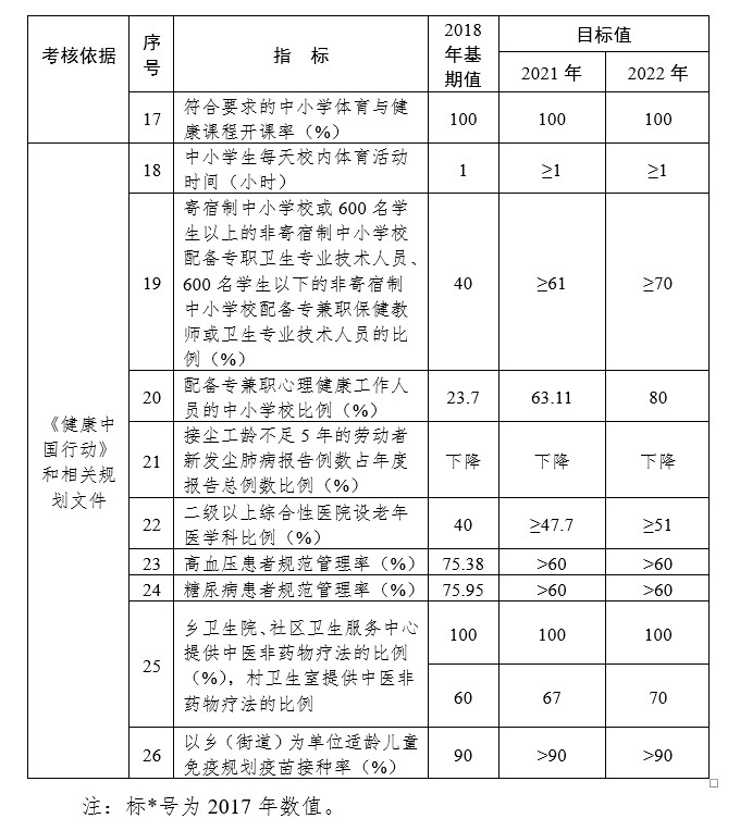到2022年,促进全民健康的政策体系基本建立,全民健康素养水平稳步提高,健康生活方式加快推广,重大慢性病发病率上升趋势得到遏制,重点传染病、严重精神障碍、地方病、职业病得到有效防控,致残和死亡风险逐步降低,重点人群健康状况显著改善,人均预期寿命达到全市平均水平。