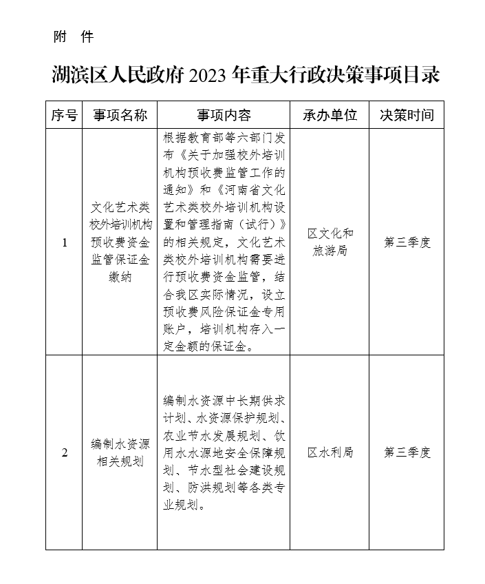 附件:湖滨区人民政府2023年重大行政决策事项目录