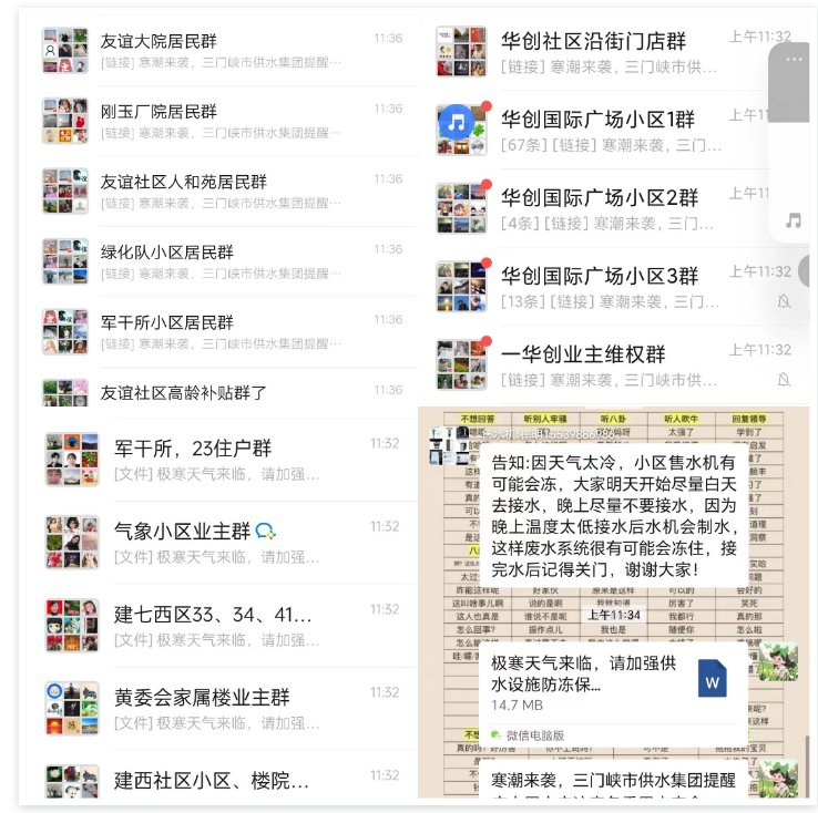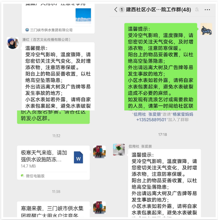 广泛开展宣传提醒。采用线上+线下形式,多渠道提醒居民。密切关注极端天气预警信息,充分利用微信群、朋友圈、张贴温馨提示等宣传方式,及时转发低温暴雪冰冻灾害预警信息,提醒广大民众防寒保暖、安全出行,扩大公众获取寒冷天气预警信息的渠道和范围;对沿街商户进行走访,号召大家及时清理门前积雪,确保门前不积水不结冰,共同打造方便、干净的出行环境。