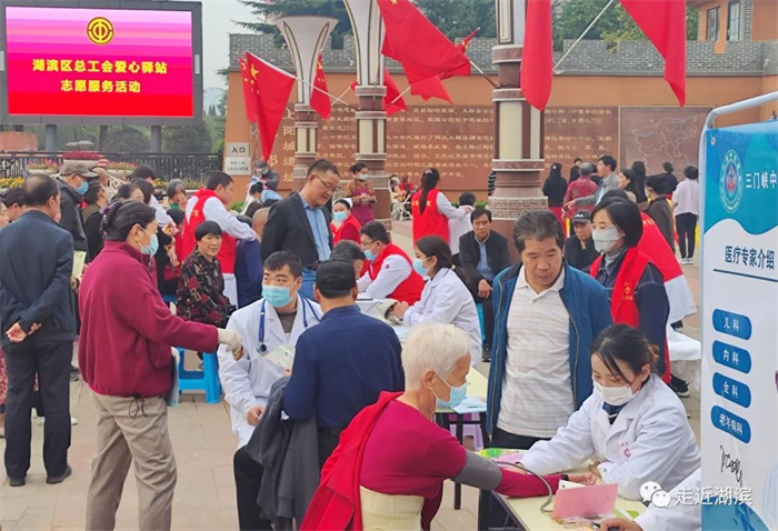 10月17日,湖滨区总工会联合区人社局、武强中医院、瑞康医院、高端家政等单位在植物园广场开展了用工信息宣传、义诊、理发、推拿等爱心驿站志愿者服务活动。
