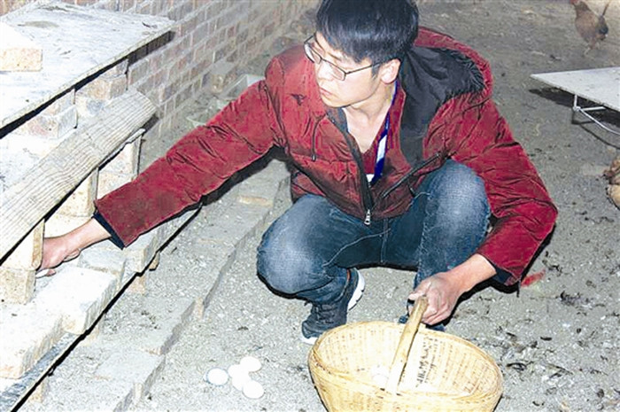 三月七日下午,高斌在鸡舍里捡收鸡蛋。 冯宝著 摄