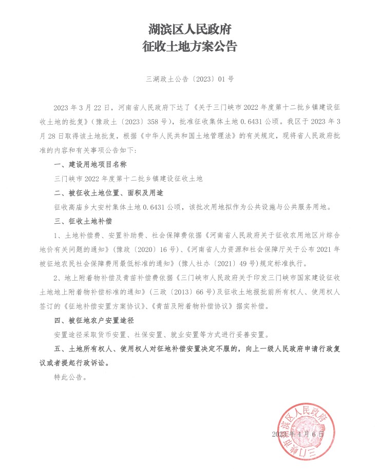 湖滨区人民政府征收土地方案公告(三湖政土公告〔2023〕01号)