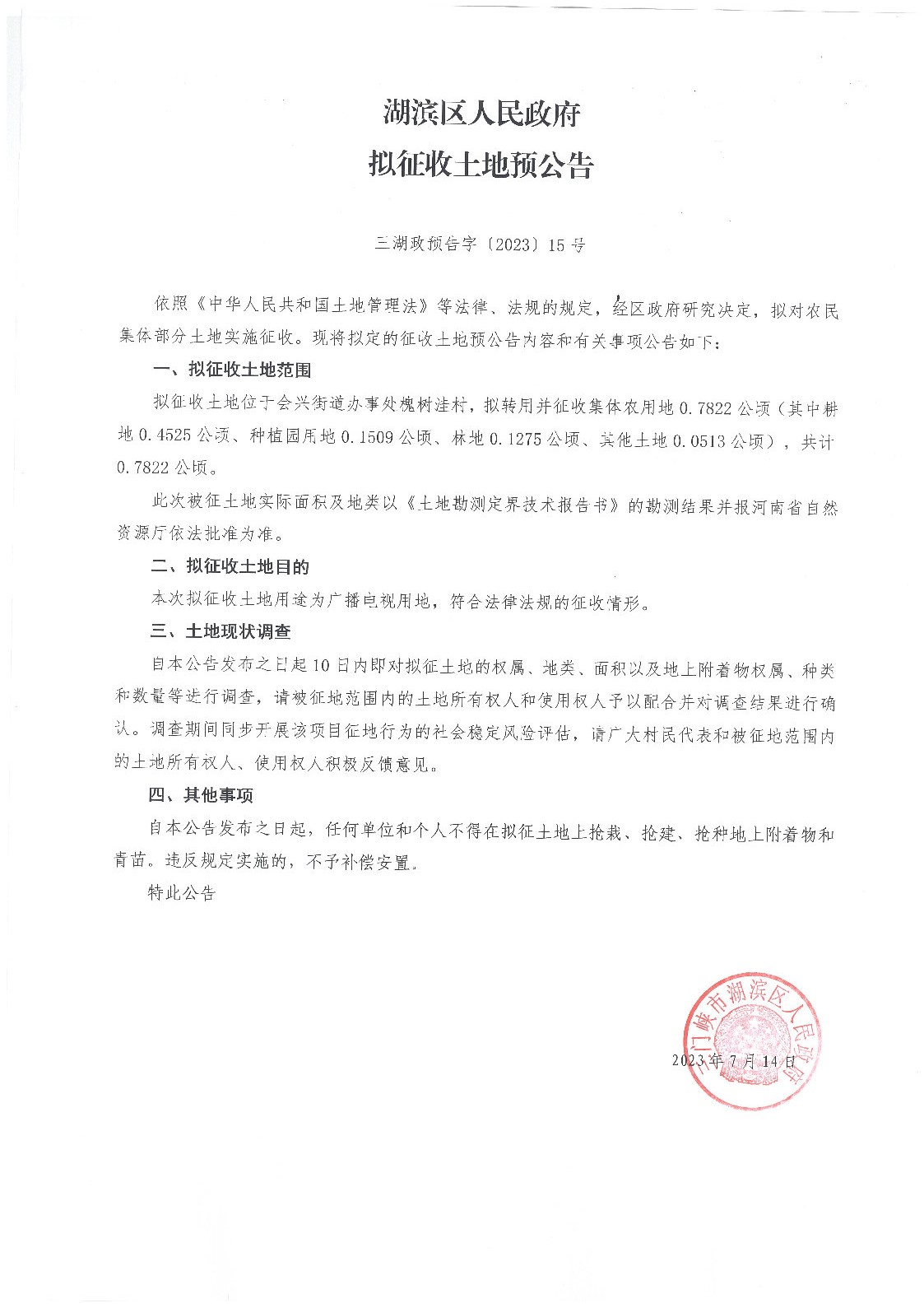 湖滨区人民政府拟征收土地预公告(三湖政预告字〔2023〕15号)