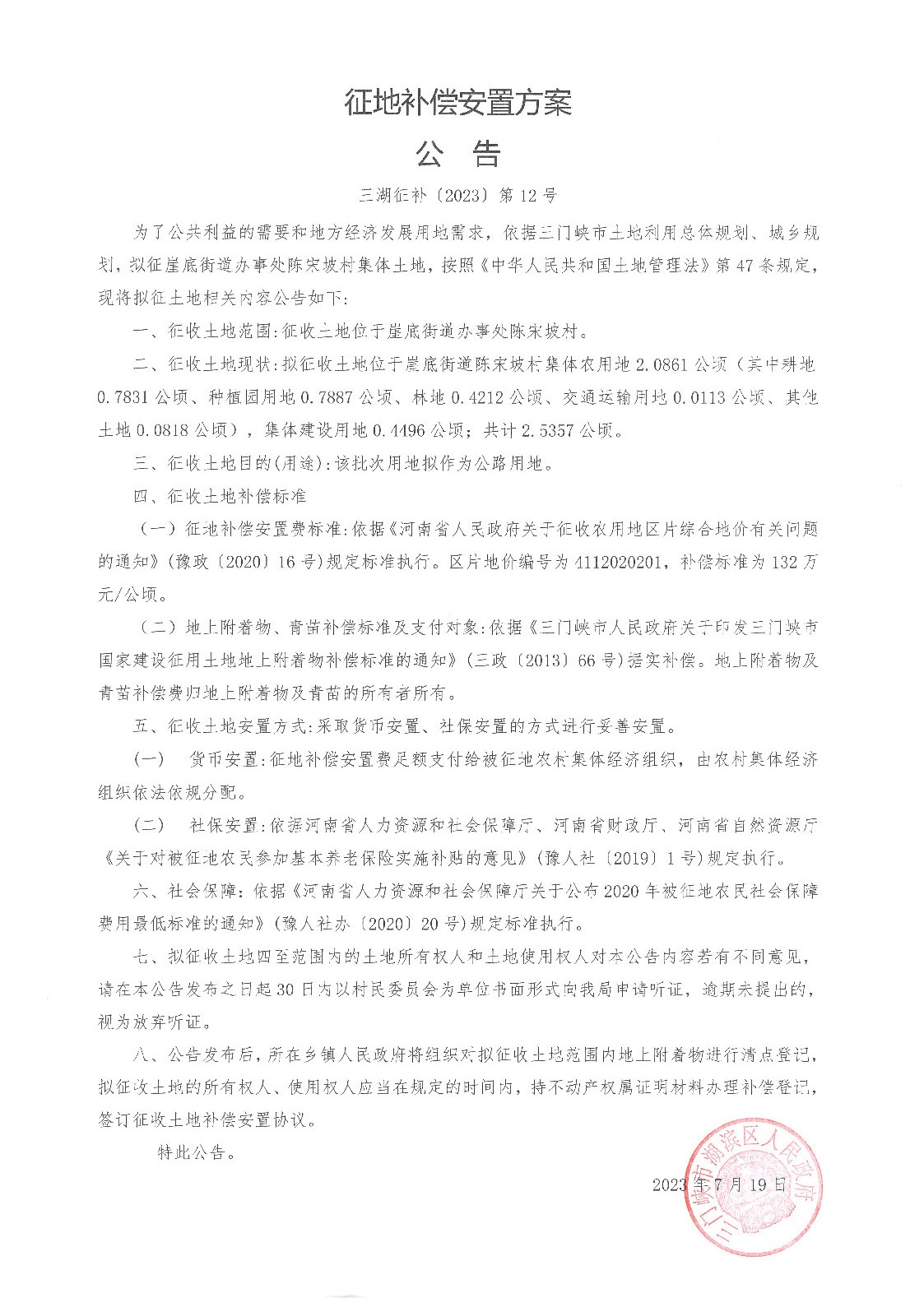 征地补偿安置方案公告(三湖征补〔2023〕第12号)