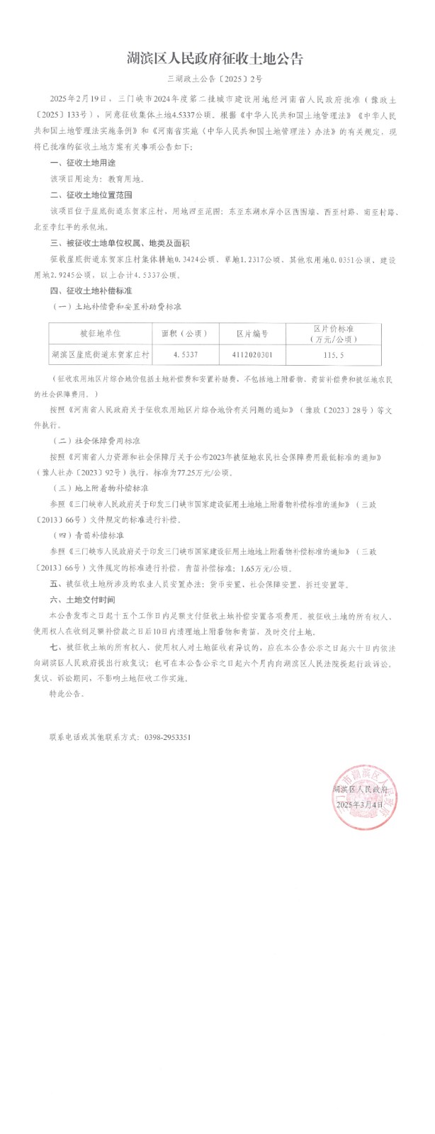 湖滨区人民政府征收土地公告(三湖政土公告〔2025〕2号)
