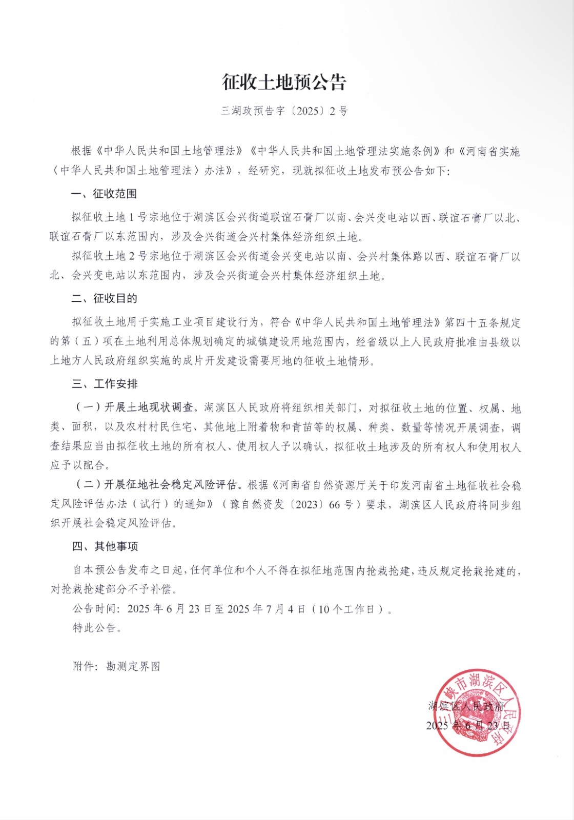 湖滨区人民政府征收土地预公告(三湖政预告字〔2025〕2号)