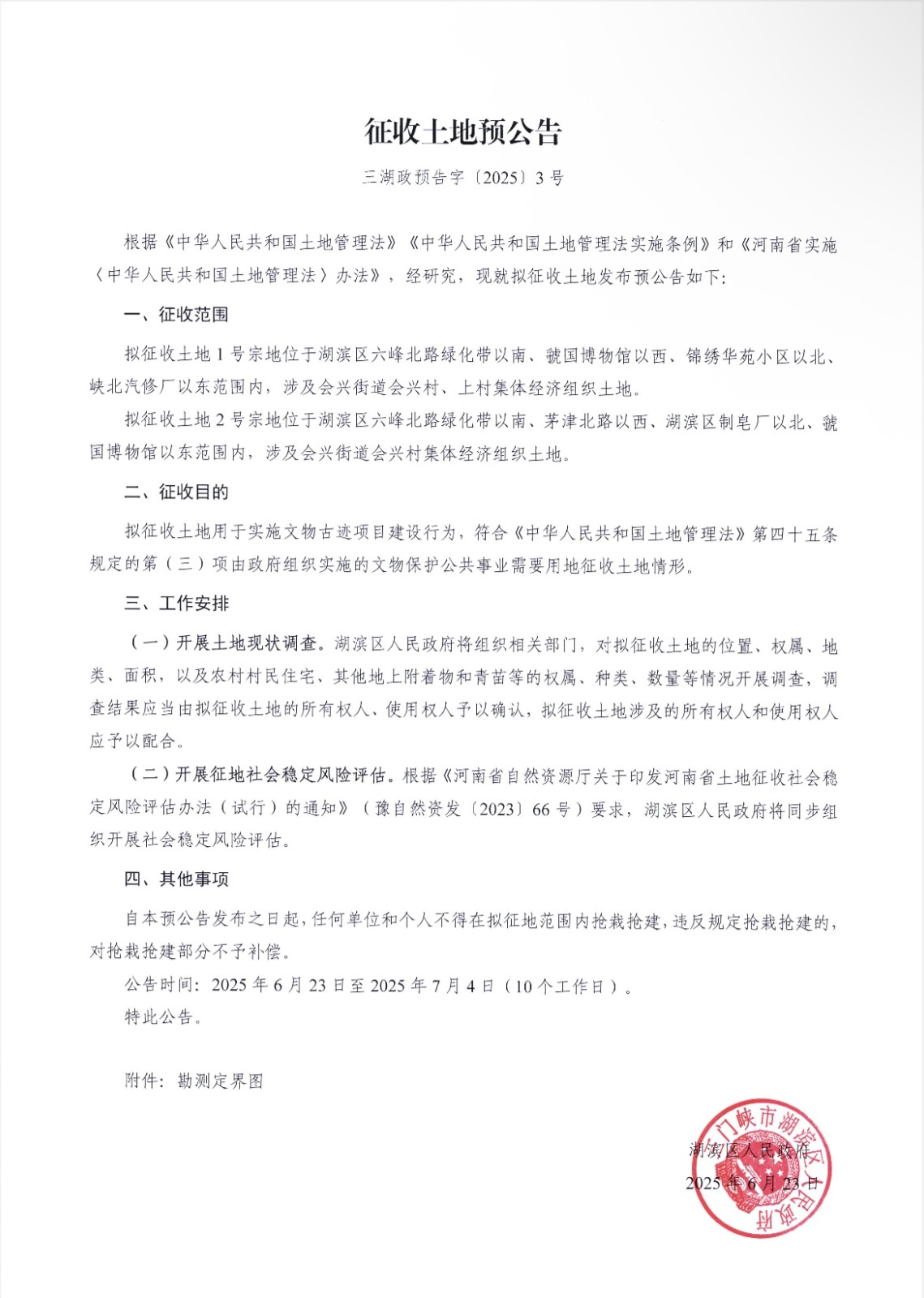 湖滨区人民政府征收土地预公告(三湖政预告字〔2025〕3号)