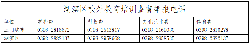 感谢您长期以来对我区教育工作的关心和支持!为持续巩固“双减”工作成果,坚决防止违规学科类校外培训“反弹”,强化非学科类培训监管,保障广大学生家长合法权益及财产安全,在暑期来临之际,湖滨区“双减”工作协调机制办公室再次温馨提示您:学生学习的主阵地在校内、主渠道在课堂,孩子的学业成长,关键是让孩子专注课堂学习,养成独立思考习惯,提高自主学习能力。假期是学生调整学习状态的黄金时间,也是家长与孩子深入交流、拉近亲子关系的宝贵机会,过重的校外培训负担不利于孩子身心健康成长。我们真诚地希望家长能够进一步树立科学教育理念,遵循教育规律和孩子成长规律,理性看待校外培训,不盲从、不攀比、不跟风,与孩子一起科学合理安排好暑假假期学习生活。按照国家“双减”政策相关要求,暑假期间全区3家合规的学科类培训机构将暂停学科类培训,凡是打着“教育咨询、托管辅导、文化传播、家庭教育指导、游学研学、夏令营”等名义开展的培训,都属于违规培训;任何面向中小学生开展的学科类培训,不管是机构还是个人均为违法违规行为,一经发现,将严肃查处。一看培训资质。证照齐全的校外培训机构(“证”即指办学许可证或办学审核同意书,“照”即指营业执照)证照齐全才是合规的机构。请务必在“全国校外教育培训监管与服务综合平台”(网址:https://xwpx.eduyun.cn/)或下载校外培训家长端APP内进行查询并选择。二看场所安全。是否存在场地、设施、消防等安全隐患;是否已安装完备的视频监控系统并正常使用。培训场所是否能保证同一培训时段内生均培训用房面积不少于3㎡(目测是否拥挤、易疏散),疏散通道、安全出口是否畅通等。三看师资情况。教师是否有学历证书、教师资格证书或专业技术等级证书等。四看信息公示。校外培训机构是否规范张贴机构信息(证照、党建、安全、课程设置、从教人员信息、监督举报电话等);校外培训机构一校一址,分校也是独立办证。五看如何缴费。为防止发生“退费难”“卷钱跑路”等问题,请各位家长务必在“校外培训家长端”APP选课、购课、依规缴费,一次性缴费不得超过3个月或60课时,金额不得超过5000元。在缴费前,应确认收款方单位名称与培训合同、机构证照上的名称是否一致,切勿直接向机构或员工个人转账缴费。各位家长,孩子是祖国的未来,让我们共同携手营造良好社会氛围,构建和谐教育生态,一起守护孩子健康快乐成长。相信在您的正确教育、引导和关怀下,孩子一定会度过一个充实、快乐而有意义的暑假,并能以充沛的精力和饱满的情绪迎接新学期。最后,诚邀您一同参与社会监督。暑假期间,如您发现我区校外培训机构存在违规行为,请及时向主管部门投诉举报。