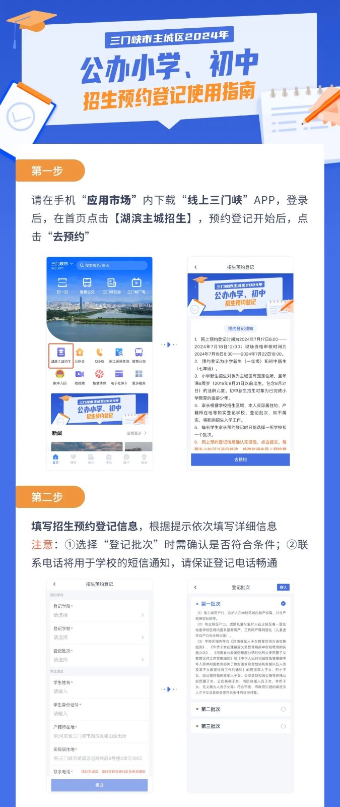 2.网上预约登记。7月17日8:00-18日12:00,家长登陆“线上三门峡”手机APP,根据学校招生区域、实际居住地、户籍信息等选择符合报名条件的学校、招生批次,登记学生姓名、身份证号、户籍所在地、实际居住地、预报名学校、联系电话等信息,每名学生只能登记一所学校,学生家长要根据学校招生区域和本人实际居住地、户籍信息等如实选择学校、批次,登记信息。