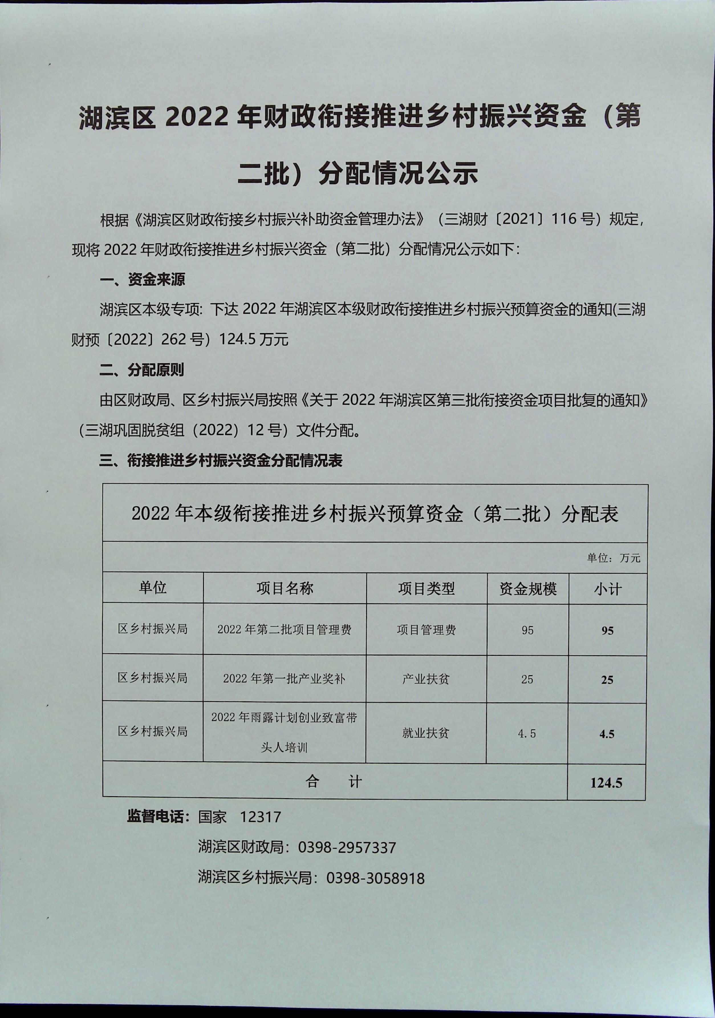 湖滨区2022年财政衔接推进乡村振兴资金(第二批)分配情况公示