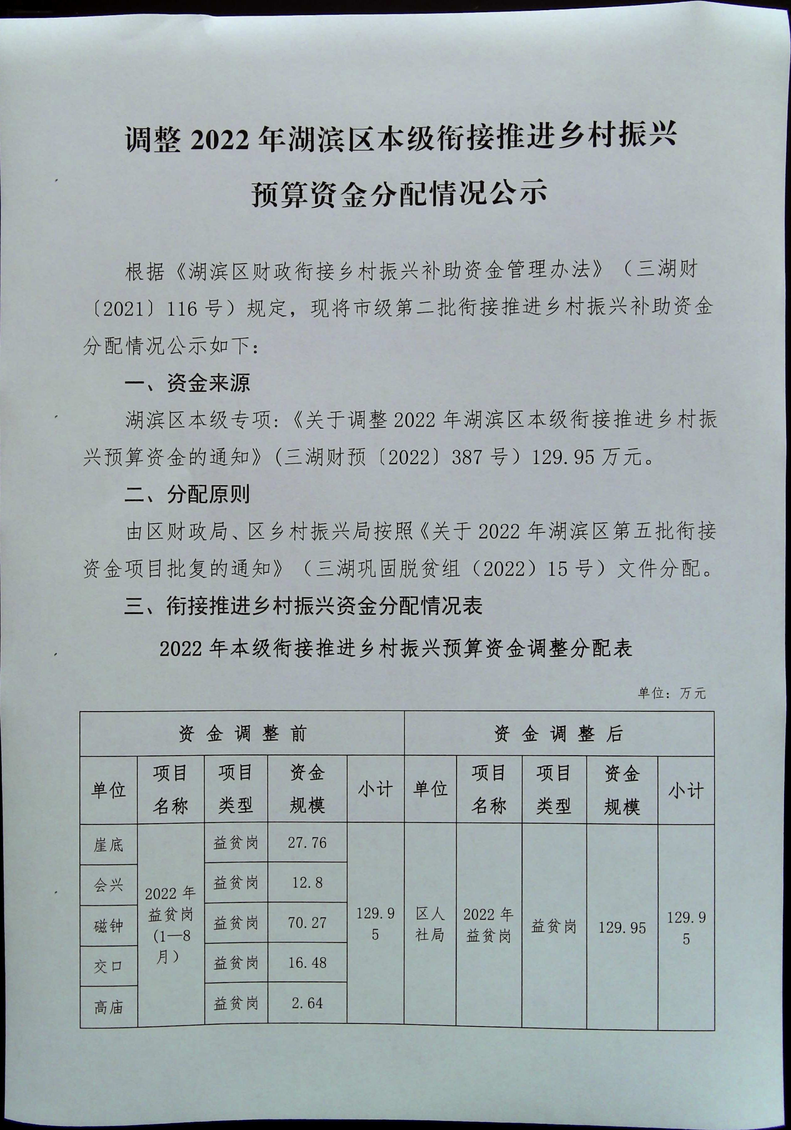 调整2022年湖滨区本级衔接推进乡村振兴 预算资金分配情况公示