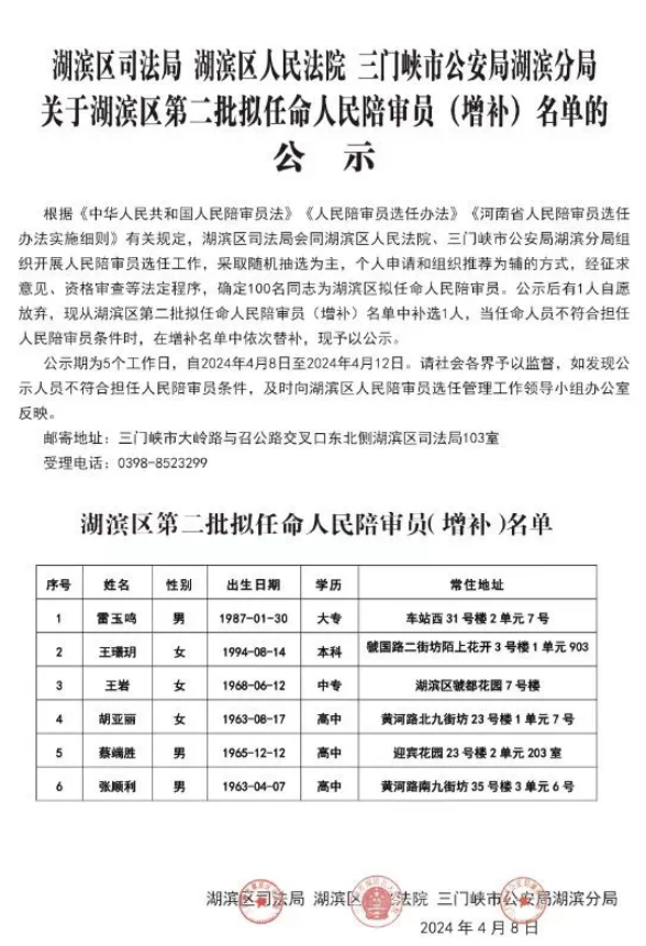 根据《中华人民共和国人民陪审员法》《人民陪审员选任办法》《河南省人民陪审员选任办法实施细则》有关规定,湖滨区司法局会同湖滨区人民法院、三门峡市公安局湖滨分局组织开展人民陪审员选任工作,采取随机抽选为主,个人申请和组织推荐为辅的方式,经征求意见、资格审查等法定程序,确定100名同志为湖滨区拟任命人民陪审员。公示后有1人自愿放弃,现从湖滨区第二批拟任命人民陪审员(增补)名单中补选1人,当任命人员不符合担任人民陪审员条件时,在增补名单中依次替补,现予以公示。