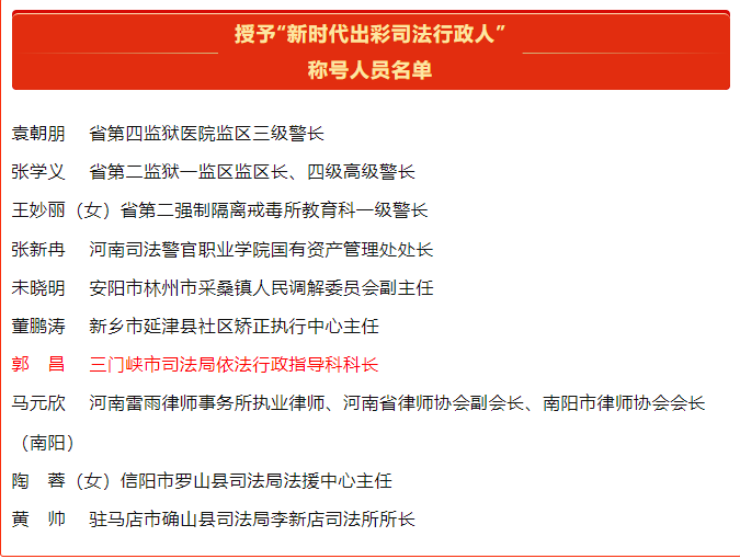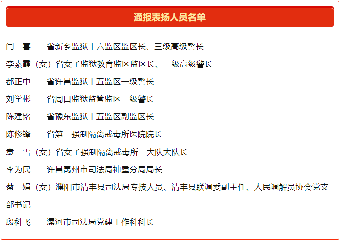 日前,为深入贯彻落实党的二十大精神,推动学习贯彻习近平新时代中国特色社会主义思想主题教育走深走实,激发广大司法行政干警和法律服务工作者干事创业热情,展现新时代司法行政人的良好精神风貌,省司法厅在全省司法行政系统组织开展了新时代出彩司法行政人评选活动。经逐级推荐、网络投票、评委会评审等环节,经厅党委研究,决定授予省第四监狱医院监区三级警长袁朝朋等10名同志新时代出彩司法行政人称号,给予省新乡监狱十六监区监区长、三级高级警长闫喜等10名同志通报表扬。