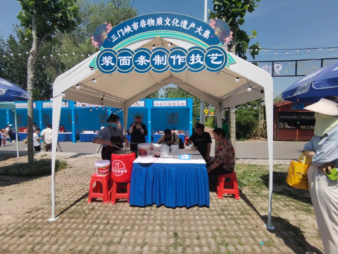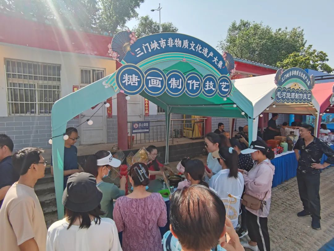 活动现场,湖滨区非遗项目,浆面条制作技艺、大豆酱古法制作技艺、黑酒古法酿制技艺、糖画制作技艺、青梅酿造技艺、小酥肉制作技艺、任记水花佛手糖糕、香包制作技艺等,参与展览、展销和互动体验。