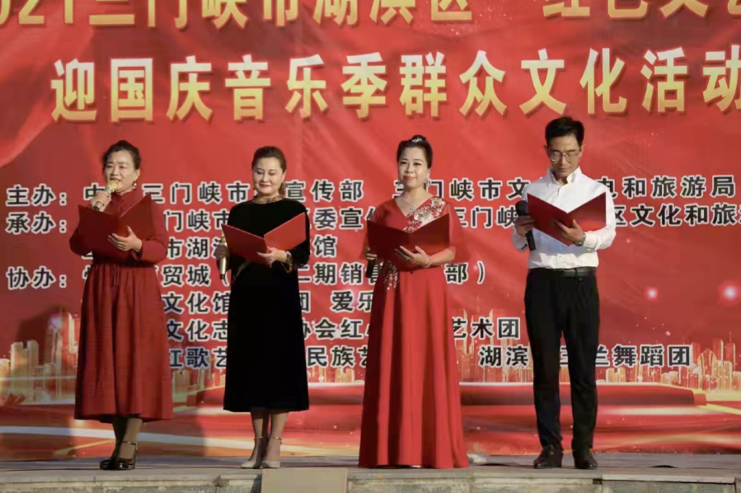 举国同庆日,共度华诞时。为庆祝祖国七十二周年华诞,2021年9月29日9月30日在湖滨区宏江中心广场举办湖滨区红色文艺轻骑兵迎国庆音乐季群众文化展演活动。本次活动由三门峡市委宣传部、三门峡市文化广电和旅游局主办,湖滨区委宣传部、湖滨区文化和旅游局、湖滨区文化馆承办,悦邻商贸城、湖滨区文化馆合唱团、爱乐乐团、湖滨区文化志愿者协会红心舞动艺术团、湖滨区红歌艺术团、民族艺术团、湖滨区玉兰舞蹈团协办。
