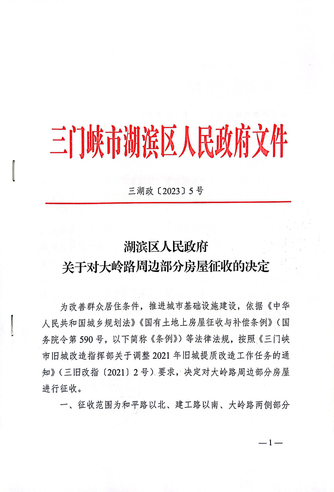 关于对大岭路周边部分房屋征收的决定