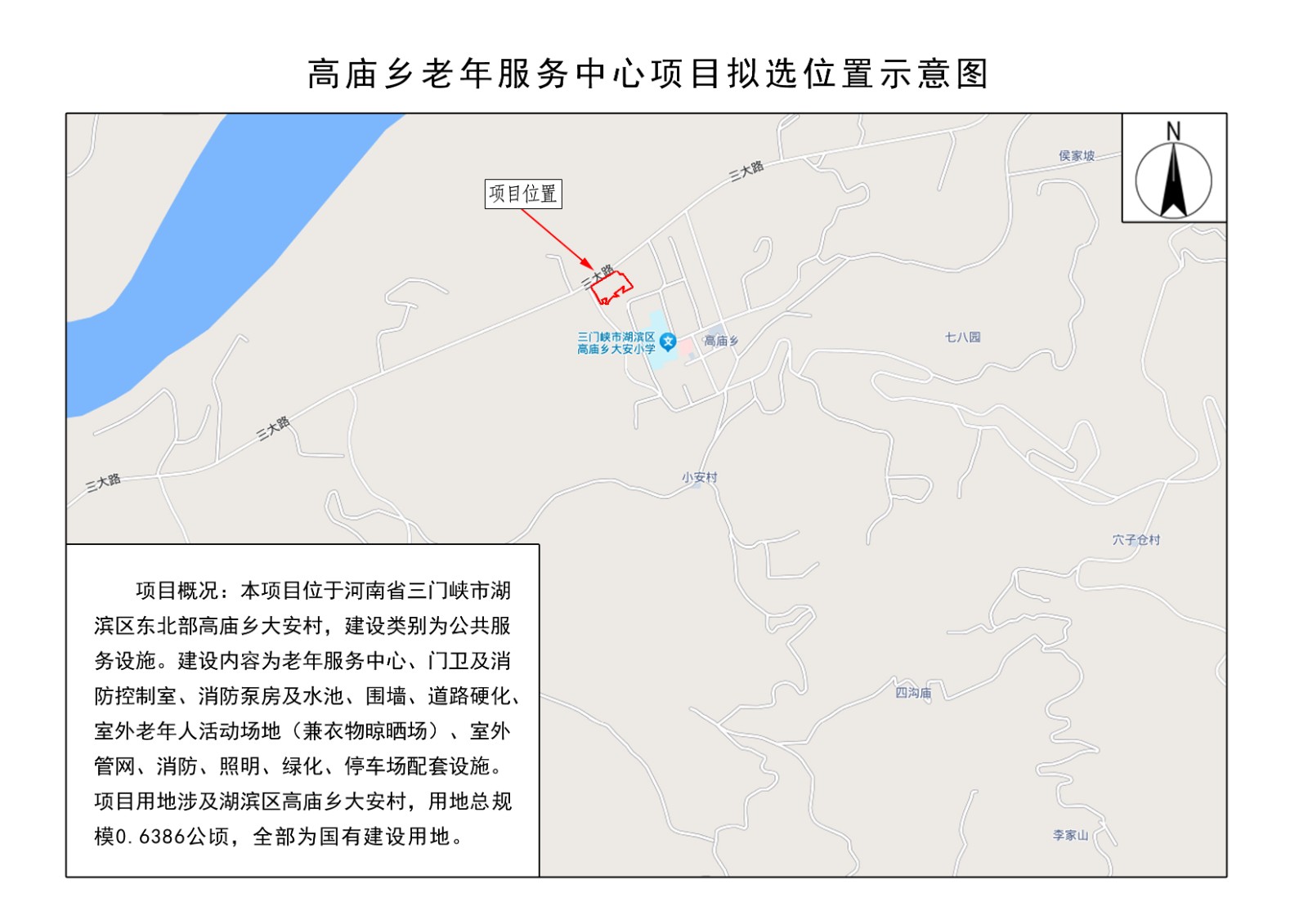 项目概况:本项目位于河南省三门峡市湖滨区东北部高庙乡大安村,建设类别为公共服务设施。建设内容为老年服务中心、门卫及消防控制室、消防泵房及水池、围墙、道路硬化、室外老年人活动场地(兼衣物晾晒场)、室外管网、消防、照明、绿化、停车场配套设施。项目用地涉及湖滨区高庙乡大安村,用地总规模0.6386公顷,全部为国有建设用地。