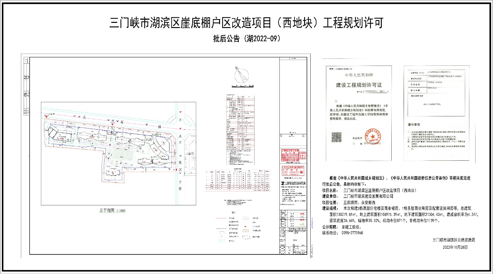 三门峡市湖滨区崖底棚户区改造项目(西地块)工程规划许可 批后公告(湖2022-09)
