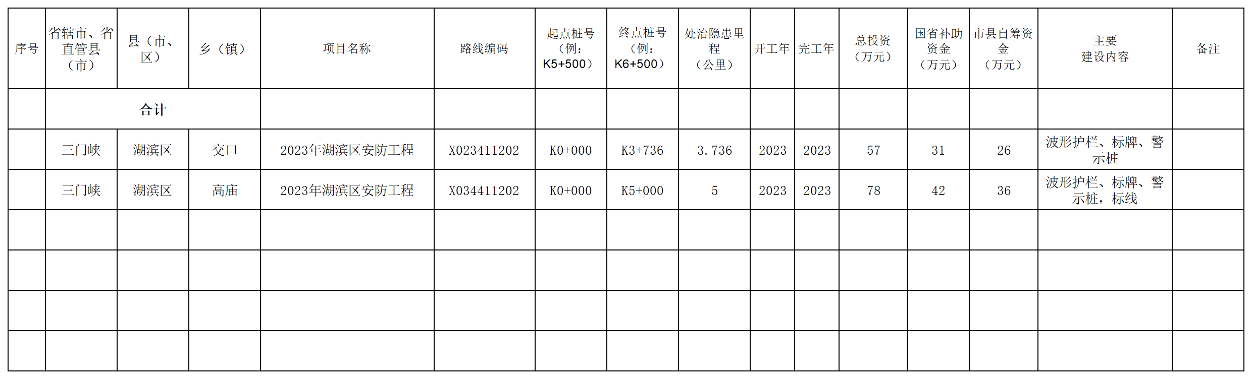 根据豫交规划函【2022】540号《河南省交通运输厅关于下达河南省2023年第一批农村公路建设项目投资计划的通知》精神,现下达我区2023年第一批农村公路生命安全防护工程项目2条路8.736公里,现予以公示。