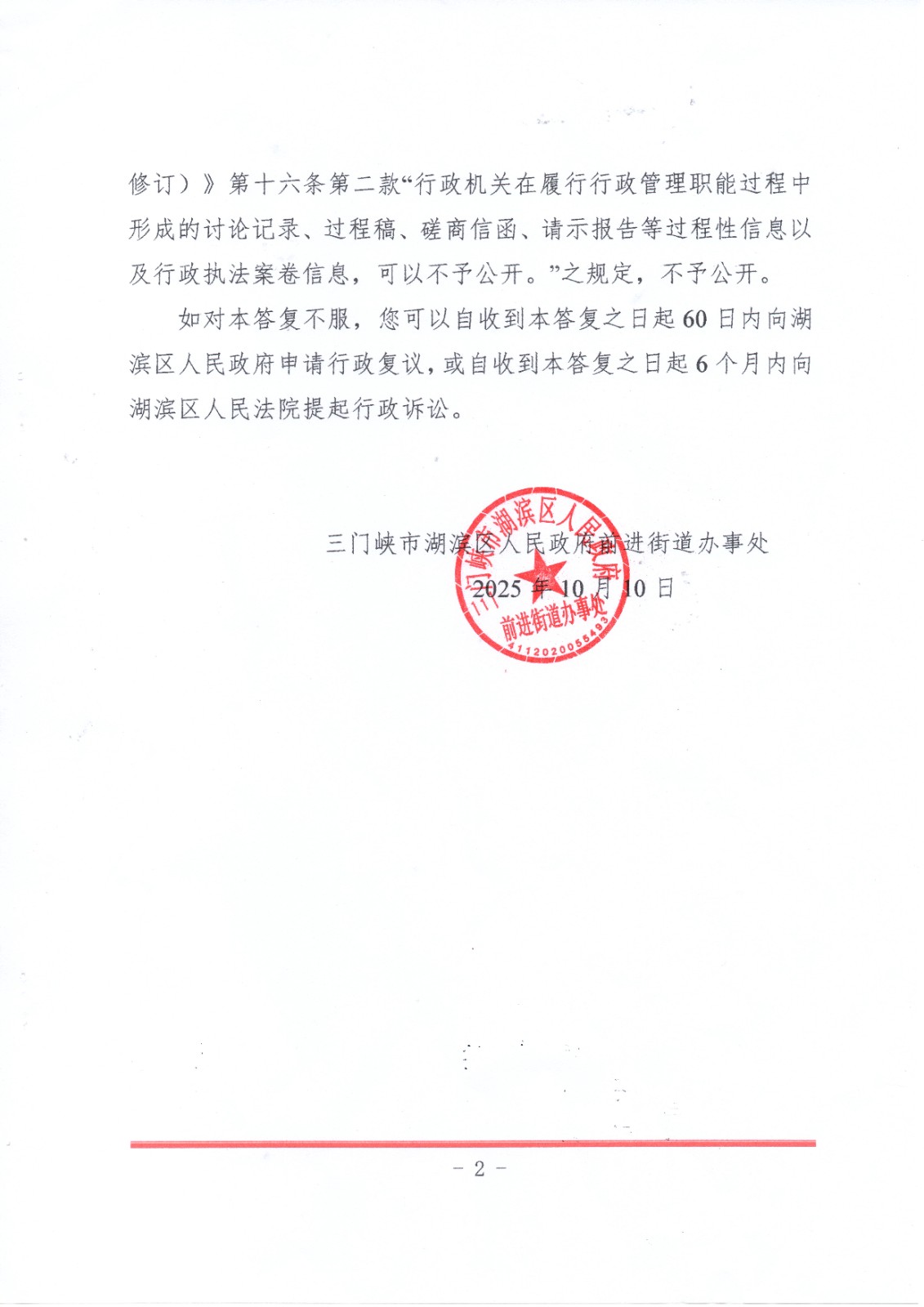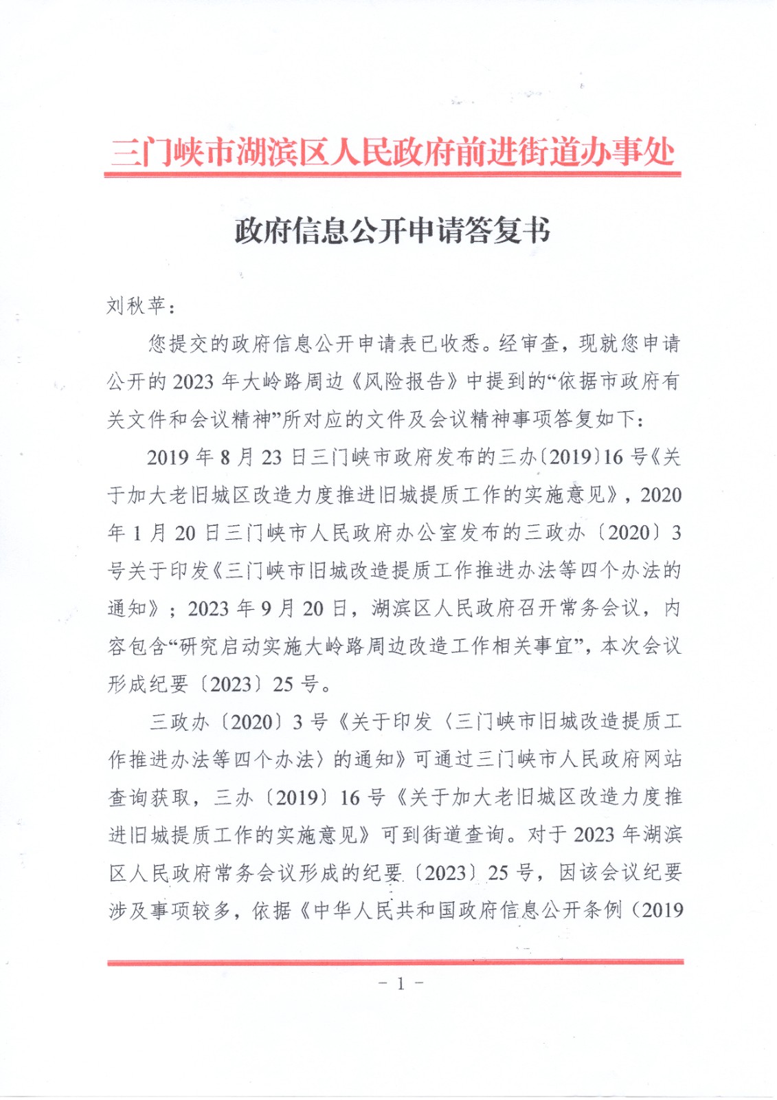 前进街道办事处关于刘秋苹政府信息公开申请的答复